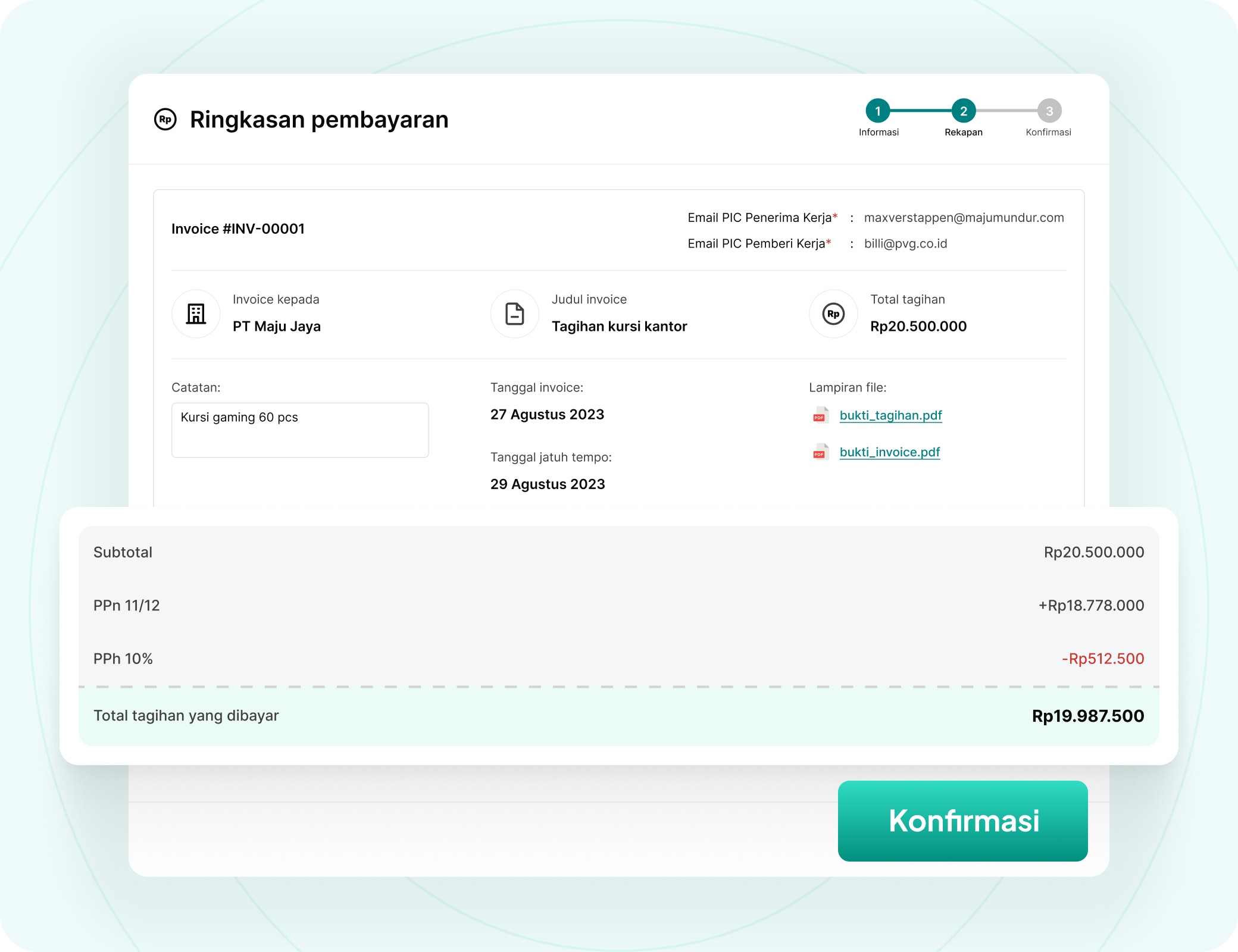 Vendor mendaftar dan mengirimkan invoice langsung melalui platform, sementara perusahaan mengelola persetujuan, pembayaran, dan pelaporan dalam satu sistem terpusat